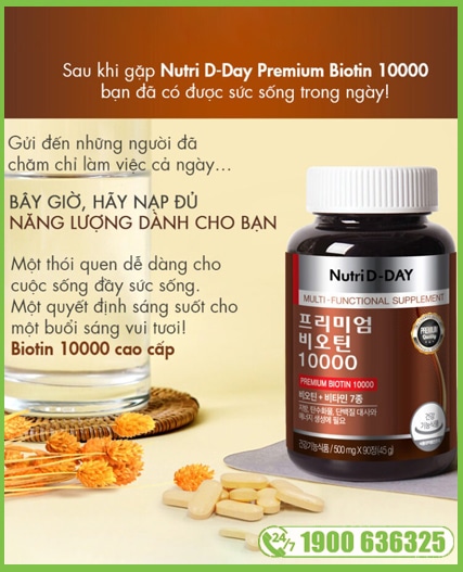 » PREMIUM Biotin 10000 Nutri D-Day là viên uống có hàm lượng Biotin cao kết hợp với các vitamin khoáng chất tổng hợp khác giúp bạn luôn khỏe mạnh và tràn đầy năng lượng, giúp đối phó với tình trạng rụng tóc, tóc xơ cứng, và da nhờn.